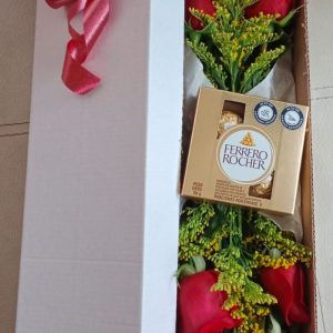 Caja grande con 5 girasoles, llena de rosas y ferrero por 8 unidades