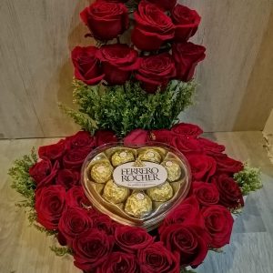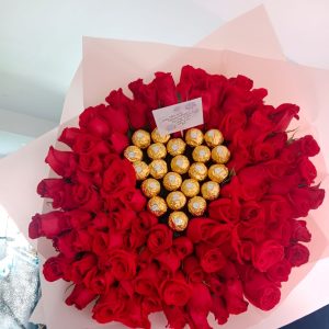 Bouquet con 24 chocolates ferrero, 150 rosas, corona y mariposas