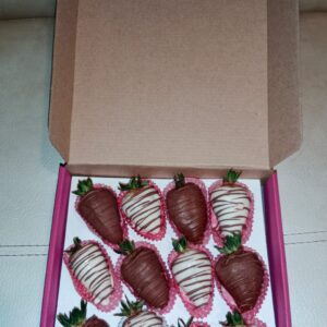 Caja por 12 rosas, 8 fresas achocolatadas y globo grande metalizado