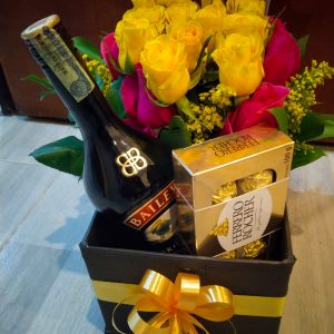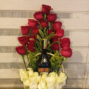 Arreglo de rosas con media botella de baileys y globo metalizado