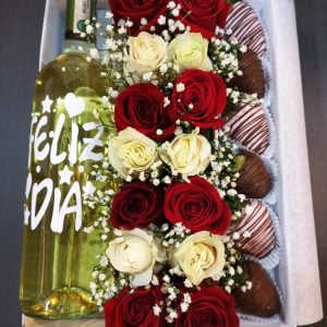 Caja de minirosas, vino gato negro y ferrero por 12 unidades